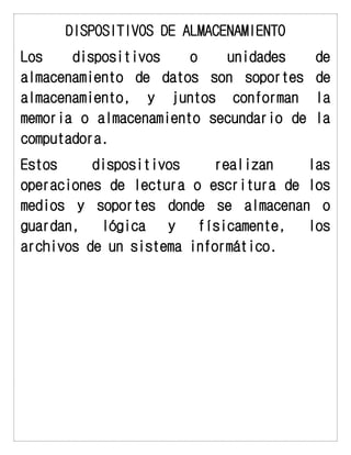 Este documento describe diferentes dispositivos de almacenamiento como discos duros, memorias USB, unidades de disco y discos ópticos. Explica que los discos duros tienen gran capacidad pero no son extraíbles, mientras que las memorias USB son extraíbles pero tienen menos capacidad. También describe las características y componentes de las unidades de disco.