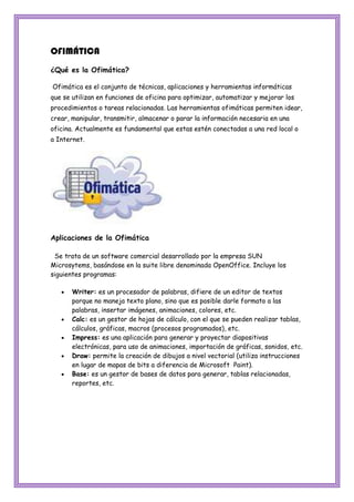 El documento habla sobre la ofimática. Define la ofimática como el conjunto de técnicas y herramientas informáticas que se utilizan para optimizar tareas de oficina. Luego menciona algunas aplicaciones comunes de ofimática como Writer para procesamiento de texto, Calc para hojas de cálculo, Impress para presentaciones, Draw para dibujo y Base para bases de datos. Finalmente, enumera algunos de los principales paquetes de ofimática como Microsoft Office, OpenOffice y Corel WordPerfect.