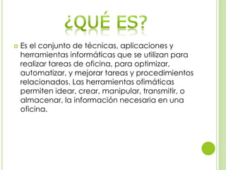 El documento describe herramientas ofimáticas de Microsoft, que optimizan y automatizan tareas de oficina. Detalla programas como Access, OneNote, Outlook, SharePoint, Word, Publisher, PowerPoint y Excel, explicando sus funcionalidades específicas, desde la manipulación de datos hasta la creación de presentaciones. Se enfatiza en la capacidad de estos software para mejorar la colaboración y la eficiencia en el trabajo de oficina.