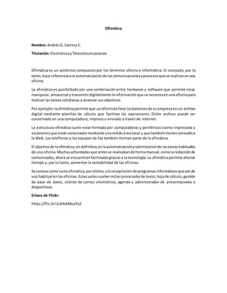 La ofimática se refiere a la automatización de procesos y comunicaciones en una oficina a través del uso combinado de hardware y software. Esto permite crear, almacenar y compartir información digitalmente para tareas como llevar balances financieros en hojas de cálculo o redactar comunicados. La estructura típica de una oficina digital incluye computadoras, impresoras, escáneres y otros dispositivos conectados en red para optimizar y automatizar el trabajo habitual de una oficina.