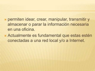 La ofimática se refiere al conjunto de técnicas y herramientas informáticas como procesadores de texto, hojas de cálculo y presentaciones que se usan para optimizar tareas de oficina. Algunas de las herramientas principales de ofimática son procesadores de texto para crear documentos, hojas de cálculo para manipular datos numéricos y programas de correo electrónico para enviar y recibir mensajes. Actualmente, las herramientas de ofimática a menudo están conectadas a redes e Internet y existen suites ofimáticas que