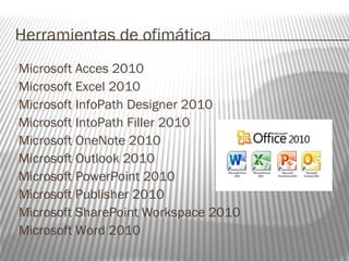 La ofimática se refiere al conjunto de técnicas y herramientas informáticas utilizadas para optimizar tareas de oficina, incluyendo aplicaciones de Microsoft como Access, Excel, InfoPath, OneNote, Outlook, PowerPoint, Publisher, SharePoint Workspace y Word, las cuales permiten crear una variedad de documentos como tablas, gráficos, formularios y presentaciones para mejorar el flujo de trabajo en una oficina.