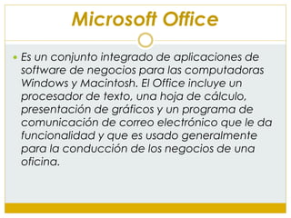 El documento describe las principales herramientas ofimáticas de Microsoft Office 2010, incluyendo Microsoft Access, Excel, InfoPath, OneNote, Outlook, PowerPoint, Publisher, SharePoint Workspace y Word. Para cada programa, se proporcionan algunas de sus características clave y ejemplos de usos.