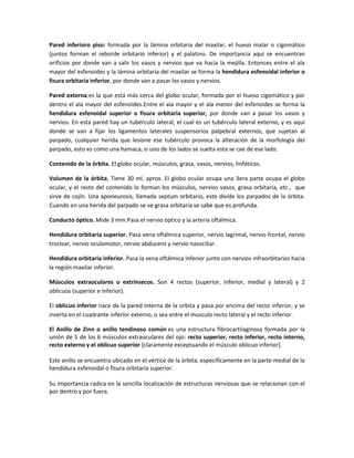 El documento resume la anatomía de la órbita y el globo ocular. La órbita tiene forma de pirámide invertida y está formada por 7 huesos que forman 4 paredes. Contiene el globo ocular, músculos, vasos y nervios. El globo ocular tiene 3 capas concéntricas y contiene humor acuoso, cristalino y humor vítreo. La córnea y esclera forman la envoltura externa del ojo y permiten la entrada de luz a través de su transparencia.