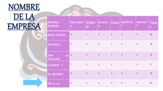 Este documento presenta un proyecto de una empresa de repostería francesa llamada "Oh La La" que se establecerá en Jalostotitlán, Jalisco. Incluye detalles sobre la misión, visión, productos, organización, finanzas y modelo de negocio de la empresa. El objetivo principal es traer sabores franceses nuevos a los consumidores locales y establecer una marca reconocida en la región.