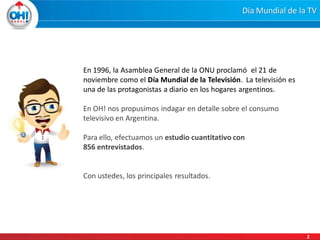 El informe del Día Mundial de la Televisión de octubre de 2013 revela hábitos de consumo televisivo en Argentina, destacando que el promedio diario es de 7.2 horas, con un incremento del uso de internet. Los argentinos prefieren programas con humor crítico e historias profundas, y expresan descontento con la publicidad intrusiva. A medida que la tecnología evoluciona, la conexión de la TV a internet se convierte en una expectativa de los televidentes.