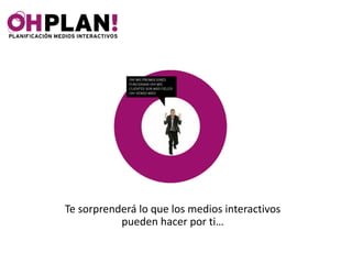 Este documento presenta las diferentes estrategias y tácticas de marketing interactivo que una agencia puede ofrecer a los anunciantes, incluyendo posicionamiento en buscadores, email marketing, publicidad en redes sociales, monitoreo de resultados, y un seminario sobre publicidad en línea impartido por la agencia. El objetivo es abrir las puertas a un nuevo mundo de oportunidades de marketing a través de los medios interactivos.