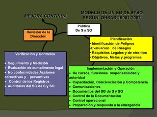 Este documento presenta varios requisitos clave para implementar un sistema de gestión de seguridad y salud ocupacional (SG SSO) de acuerdo con la norma OHSAS 18001:2007. Incluye la necesidad de documentar la política, objetivos, alcance y elementos del SG SSO, así como los procedimientos para controlar documentos, operaciones, preparación para emergencias y más. Para cumplir con cada requisito, la organización debe considerar elementos como funciones, responsabilidades, sistemas de documentación e información, y planes detallados.