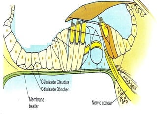Este documento describe la anatomía del oído humano, incluyendo el oído externo, medio e interno. El oído externo incluye el pabellón auricular, el conducto auditivo externo y la membrana timpánica. El oído medio contiene los huesecillos del oído (martillo, yunque y estribo) y la cavidad timpánica. El oído interno está compuesto por el laberinto óseo y membranoso, que contiene la cóclea, los canales semicirculares