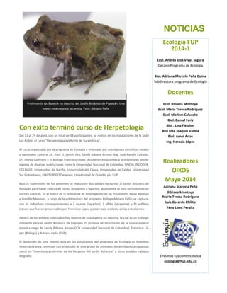 El documento presenta un boletín del Programa de Ecología de la Fundación Universitaria de Popayán. En él se informa sobre varios eventos y actividades recientes del programa, incluyendo el curso de Herpetología, la participación en la Exposición Nacional de Orquídeas, y proyectos conjuntos con la facultad de Arquitectura. También se anuncia la publicación mensual del boletín Oikos para divulgar los logros del programa.