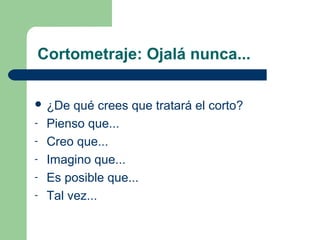 Este documento presenta un ejercicio de lenguaje sobre el uso del pretérito pluscuamperfecto de subjuntivo en español. Introduce un cortometraje titulado "Ojalá nunca..." y pide a los estudiantes que imaginen de qué tratará la película y completen oraciones con verbos en este tiempo verbal. Luego, revela las respuestas correctas y explica el significado de algunas palabras. Finalmente, propone completar más oraciones como práctica y conversar sobre cosas del pasado que no se repetirían.