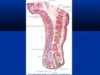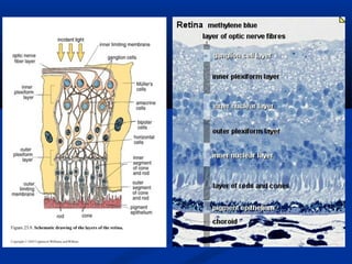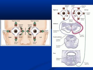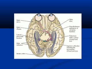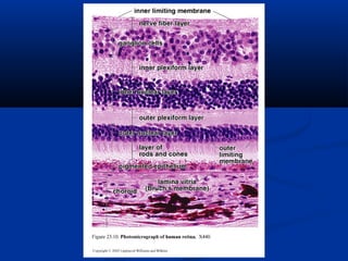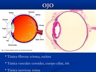 Este documento resume las principales estructuras del ojo humano. Describe las tres túnicas del ojo (fibrosa, vascular y nerviosa), con énfasis en la córnea, esclera, cámara anterior, cuerpo ciliar, procesos ciliares, iris, cristalino, coroides y retina. También cubre estructuras como la fóvea, nervio óptico, párpados, conjuntiva y glándulas lagrimales y de Meibomio. El documento provee detalles sobre la anatomía, función y componentes celulares