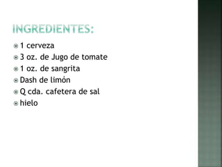 La receta describe una bebida mexicana hecha con 1 cerveza, 3 onzas de jugo de tomate, 1 onza de sangrita, un poco de limón y sal. Se coloca estos ingredientes en un tarro de cerveza con hielo previamente escarchado con chile piquín y sal. Para servir, se decora con una rama de apio, una rodaja de limón y un popote.