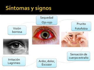 La enfermedad del ojo seco es una afección multifactorial que causa molestias, alteraciones de la visión e inestabilidad de la película lagrimal, poniendo en riesgo la superficie ocular. Su diagnóstico es clínico y requiere medir la agudeza visual, examinar la piel y parpados externamente, y usar biomicroscopia.