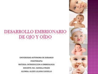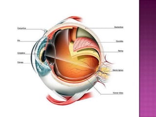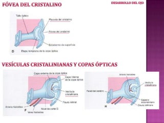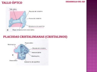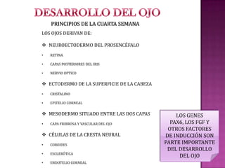 El documento resume los principales aspectos del desarrollo embriológico del ojo y sus estructuras durante la cuarta semana de gestación. Se describe que el ojo se deriva del neuroectodermo, ectodermo y mesodermo. Se explica el desarrollo de la retina, cristalino, cámara anterior, iris y otras estructuras. También se mencionan los principales genes involucrados en el desarrollo ocular como PAX6 y FGF.