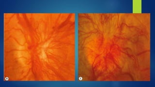 El documento describe la técnica de oftalmoscopía directa para examinar el fondo de ojo. Explica que consiste en visualizar la retina y el disco óptico a través de los medios transparentes del ojo usando un oftalmoscopio directo. Detalla las características del cabezal del oftalmoscopio, la técnica de exploración, y las estructuras que se pueden observar como la papila, vasos retinianos, mácula y cuadrantes. También resume las principales patologías que se pueden detectar como la ret