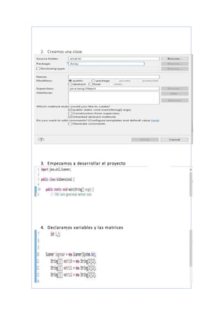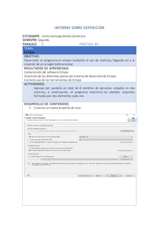 El estudiante Jimmy Santiago desarrolló un programa en Eclipse usando matrices para crear un arreglo bidimensional que permite ingresar 8 nombres de personas y luego imprimir los posibles conjuntos de dos nombres cada uno. Para lograrlo, creó un proyecto de Java en Eclipse, declaró variables y matrices, ingresó los datos en la matriz usando un ciclo for, y generó la lógica para almacenar y mostrar los conjuntos de nombres.