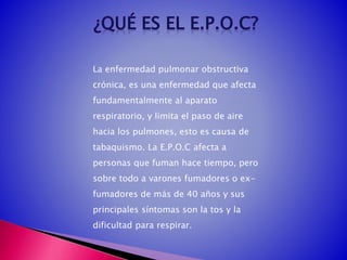 La enfermedad pulmonar obstructiva crónica (EPOC) afecta el paso de aire hacia los pulmones y es causada principalmente por el tabaquismo. Sus síntomas principales son la tos y la dificultad para respirar. El 90% de los casos de EPOC son causados por el tabaco y otros factores de riesgo incluyen la exposición a vapores químicos y factores genéticos. El único modo de prevenirla es no exponerse al tabaco u otros contaminantes.