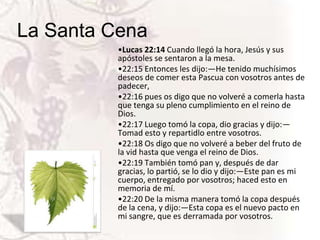 El documento describe la Santa Cena que Jesús celebró con sus apóstoles antes de su crucifixión. Jesús tomó pan y dijo "Este es mi cuerpo" y tomó vino y dijo "Esta es mi sangre", estableciendo los símbolos del pan y el vino para conmemorar su sacrificio. La Santa Cena reemplazó la Pascua judía como una ordenanza perpetua para recordar la liberación de la esclavitud a través de la muerte de Cristo.