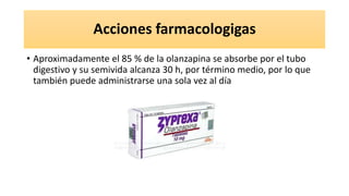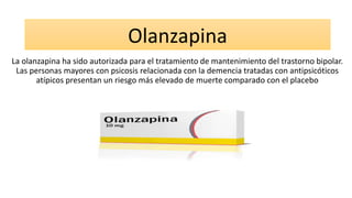 La olanzapina se usa para el tratamiento de mantenimiento del trastorno bipolar y la psicosis relacionada con la demencia. Tiene una semivida de 30 horas y se absorbe en un 85% por el tracto gastrointestinal, por lo que puede administrarse una vez al día. Sin embargo, los ancianos y personas con problemas médicos deben comenzar con una dosis más baja de 5 mg. La olanzapina y clozapina han mostrado un mayor riesgo de diabetes debido a los aumentos de peso que causan.