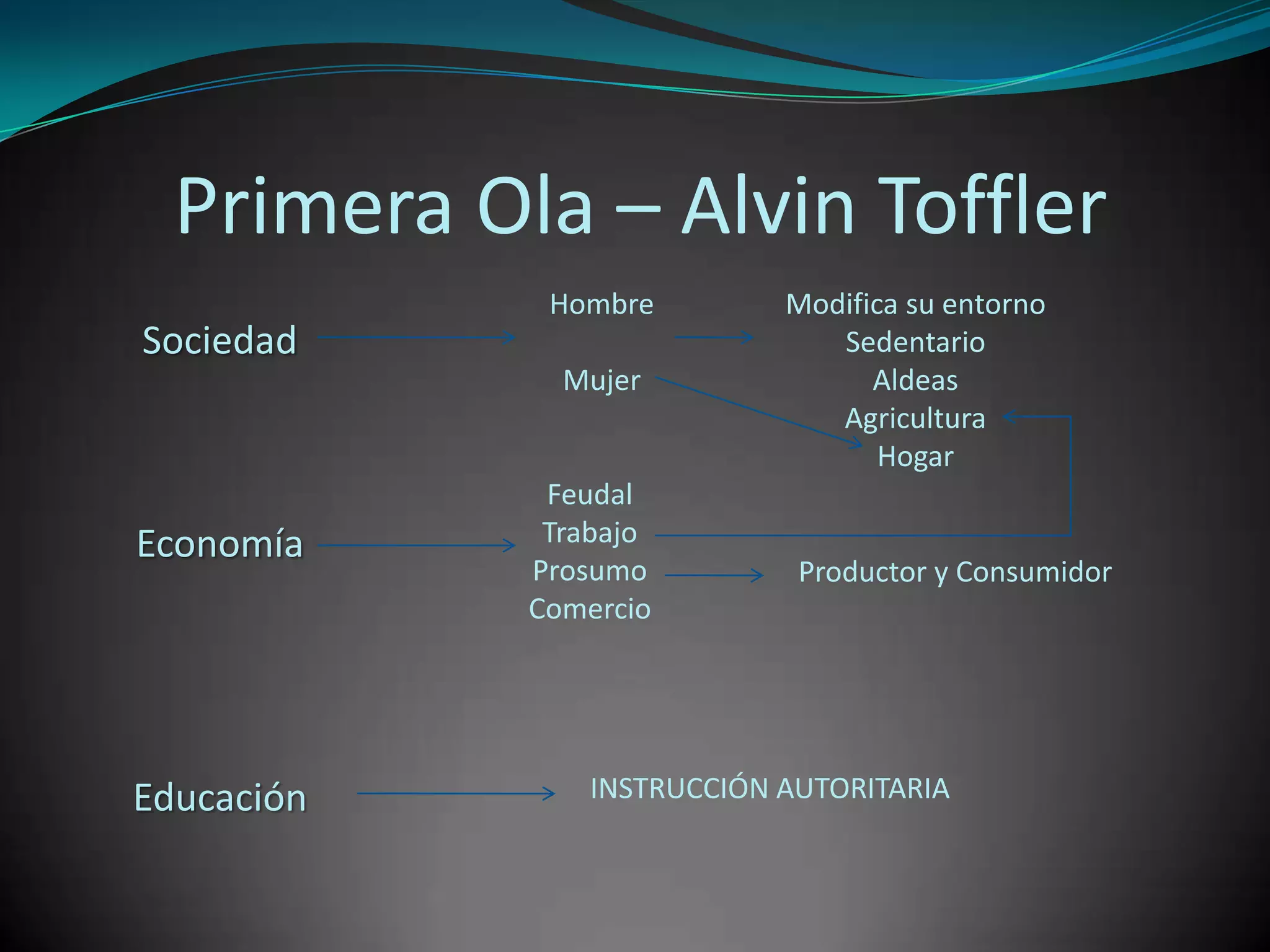 El documento resume las tres olas de cambio social descritas por Alvin Toffler. La primera ola se caracterizó por sociedades agrícolas sedentarias. La segunda ola trajo la revolución industrial y sociedades masificadas definidas por la fabricación en masa. La tercera ola implica una ruptura con la segunda ola a través de la descentralización, la desmasificación y la personalización apoyadas por sistemas cibernéticos.