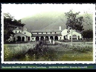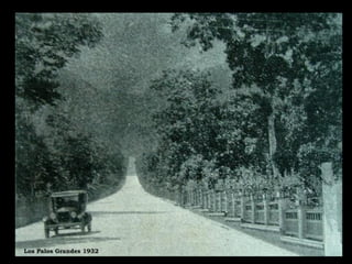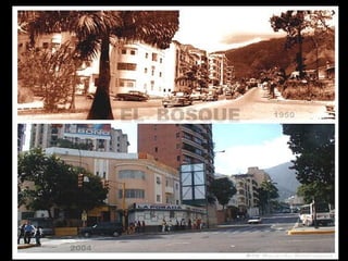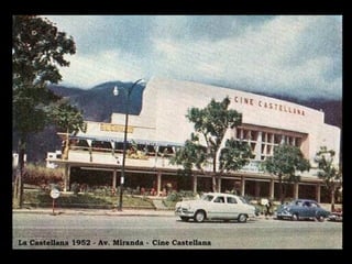 Este documento presenta una serie de fotografías y textos cortos que describen aspectos de la vieja Caracas, como los paisajes antes de la construcción de rascacielos, el primer sistema de transporte público de autobuses, un tren que conectaba a Caracas con los Valles del Tuy, y fotografías de tranvías y edificios históricos como la Parroquia La Candelaria y el Edificio Creole. El documento también honra a pioneros venezolanos de la industria petrolera como Guillermo Zuloaga y S