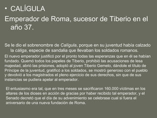 Calígula fue el emperador de Roma que sucedió a Tiberio en el año 37 d.C. Inicialmente gobernó de manera justa y generosa, pero luego se volvió loco y tiránico, cometiendo atrocidades como asesinar a personas para obtener dinero y tener relaciones incestuosas. Fue asesinado por sus propios soldados después de cuatro años de gobierno.