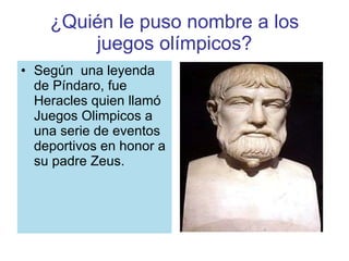 Según una leyenda de Píndaro, Heracles llamó Juegos Olímpicos a una serie de eventos deportivos en honor a su padre Zeus. Heracles era considerado hijo de Zeus y Alcmena. Los antiguos Juegos Olímpicos eran fiestas religiosas, culturales y deportivas celebradas en la antigua Grecia en honor a los Dioses Olímpicos como Zeus, Hera, Hefesto y Apolo. Algunos eventos incluían el boxeo, luchas marciales y carreras de carros.