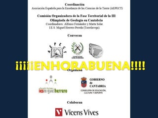 El documento describe una olimpiada de minerales en la que participaron 53 estudiantes de Cantabria. Se detallan las diferentes etapas de la olimpiada como la recogida de camisetas, el examen de 2 horas y la visita a una mina a cielo abierto. Se anuncian a los ganadores Edurne Echevarría en tercer lugar y Raquel Huidobro en cuarto lugar que representarán a Cantabria en la fase nacional en marzo.