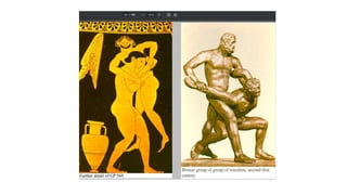Las carreras pedestres eran una parte importante de los primeros Juegos Olímpicos y consistían en correr una o dos veces la longitud del estadio. Otras pruebas incluían el lanzamiento de disco, jabalina y salto de longitud, así como carreras, lucha y pentatlón que combinaba cinco disciplinas. También había carreras de cuadrigas y caballos que eran reservadas para la élite.