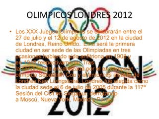 Los XXX Juegos Olímpicos se celebrarán en Londres, Reino Unido del 27 de julio al 12 de agosto de 2012. Esta será la tercera vez que Londres alberga los Juegos Olímpicos, habiéndolos organizado previamente en 1908 y 1948. Colombia ha participado en los Juegos Olímpicos desde 1932 y comenzó a ganar medallas en 1972, representada por el Comité Olímpico Colombiano.