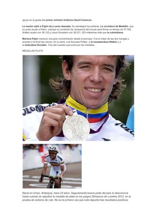 Mariana Pajón ganó la medalla de oro en BMX femenino en los Juegos Olímpicos de Londres 2012, convirtiéndose en la segunda campeona olímpica de Colombia. Rigoberto Urán ganó la medalla de plata en ciclismo de ruta masculino en los mismos Juegos Olímpicos, sorprendiendo a muchos. Óscar Figueroa falló en su levantamiento de pesas en los Juegos Olímpicos de Beijing 2008 cuando su mano se soltó de la barra.