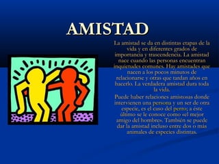 La amistad puede desarrollarse en diferentes etapas de la vida y en varios grados de importancia. La amistad comienza cuando las personas encuentran intereses comunes, aunque algunas amistades pueden formarse rápidamente mientras que otras tardan años en desarrollarse. La verdadera amistad suele durar toda la vida. Además, las relaciones amistosas también pueden existir entre personas y animales de diferentes especies.