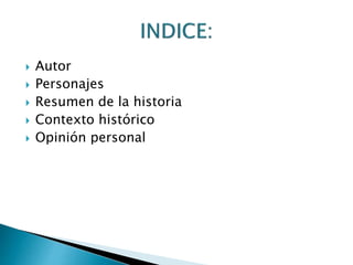 Charles Dickens escribió la novela Oliver Twist en el siglo XIX en Inglaterra. Narra la historia de Oliver, un niño huérfano que sufre maltrato en un orfanato y luego es obligado a unirse a una banda de ladrones en Londres. Finalmente, Oliver encuentra una familia que lo acoge de manera amorosa. La novela ofrece una mirada a la sociedad inglesa de la época y denuncia el trato a los niños pobres y huérfanos.