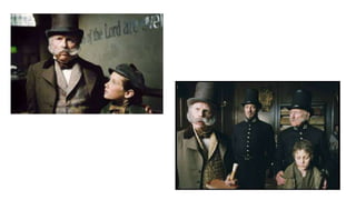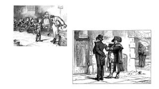 El documento resume la novela Oliver Twist de Charles Dickens. Presenta al autor británico y sus obras populares. Describe brevemente los personajes principales como Oliver, un niño huérfano; Fagin, un ladrón que explota niños; y Nancy, una mujer que intenta ayudar a Oliver. También resume el contexto histórico de la Revolución Industrial en Londres y las difíciles condiciones de vida durante ese período.
