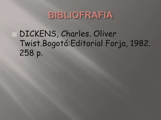 Este documento resume la novela Oliver Twist de Charles Dickens. Presenta información biográfica sobre el autor y la época victoriana en la que escribió. Describe la trama de la novela, que sigue la vida del huérfano Oliver Twist y su entrada en el mundo criminal de Londres. Explica los personajes principales y el argumento, que culmina con la adopción de Oliver por el Sr. Brownlow.