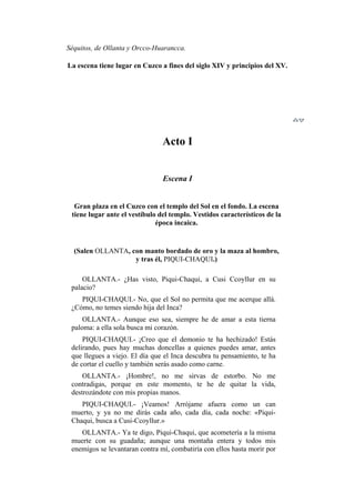 Este documento presenta la introducción de la obra de teatro incaica Ollantay. Presenta la lista de personajes principales y establece el escenario y la época en Cuzco a finales del siglo XIV y principios del XV. En la primera escena, Ollantay expresa su amor por Cusi-Ccoyllur a su sirviente Piqui-Chaqui, a pesar de las advertencias de este. Más tarde, el sumo sacerdote Huillca-Uma advierte a Ollantay sobre las consecuencias de su amor prohibido. En la últ