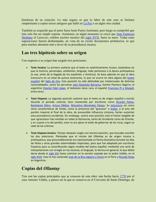 El drama Ollantay cuenta la historia de amor prohibido entre el general inca Ollantay y la hija del Inca Pachacútec, Cusi Coyllur. Cuando el Inca se entera del amor de Ollantay y Cusi Coyllur, enfurece y expulsa a Ollantay del Cuzco, encerrando a Cusi Coyllur en un calabozo donde da a luz una hija. Ollantay, creyendo que Cusi Coyllur fue asesinada, se independiza y se atrinchera en Ollantaytambo, desafi