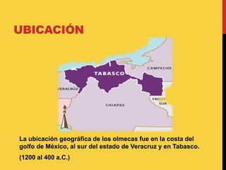 Los olmecas se ubicaron en la costa del golfo de México entre 1200-400 a.C. Su organización política era teocrática y se centraba en dioses. Fueron expertos escultores que tallaban figuras en piedra y jade, y desarrollaron un calendario y escritura que influenciaron a otras culturas mesoamericanas. Basaban su alimentación principalmente en el maíz, frijoles y calabazas cultivados de manera agrícola.