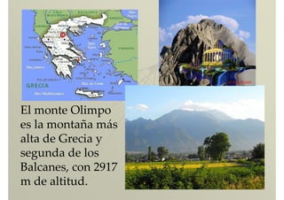 Este documento proporciona información sobre varios dioses y diosas del panteón griego y romano. Describe a deidades principales como Zeus, Hera, Ares, Hefesto, Poseidón, Hestia, Deméter, Hades, Atenea, Hermes, Artemis, Apolo y Dioniso, e incluye detalles sobre sus atributos, familias y dominios. El documento también menciona otros seres mitológicos como Cerbero y Caronte.