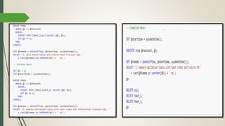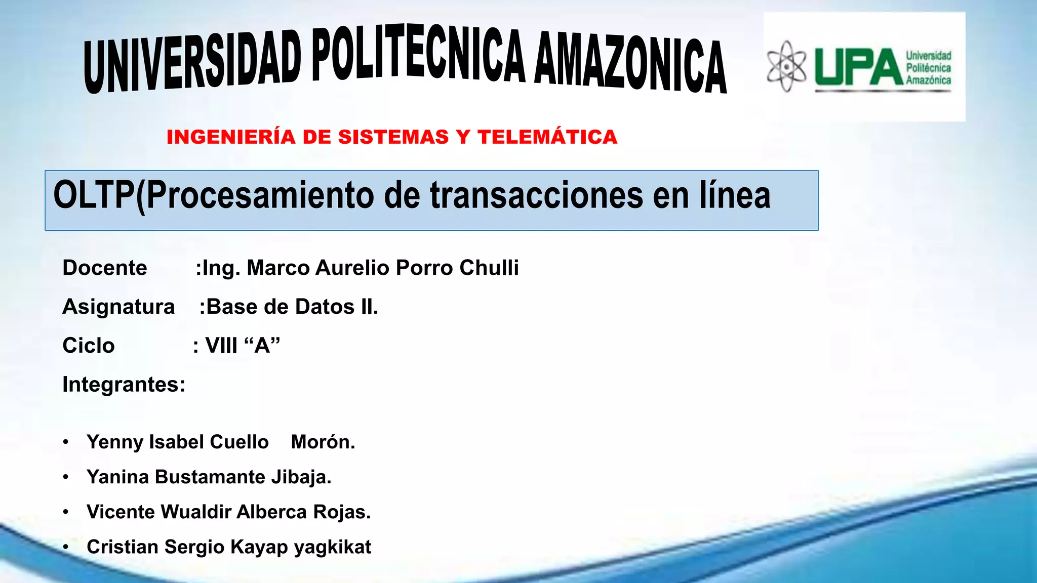 Este documento describe OLTP (procesamiento de transacciones en línea). OLTP facilita y administra aplicaciones transaccionales como entrada de datos y procesamiento de transacciones. Los sistemas OLTP proveen información confiable y precisa a grandes almacenes de datos y acceso optimizado a datos para lectura y escritura frecuentes. OLTP utiliza procesamiento cliente-servidor y software de intermediación para distribuir procesamiento de transacciones entre varias computadoras.