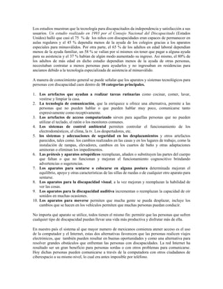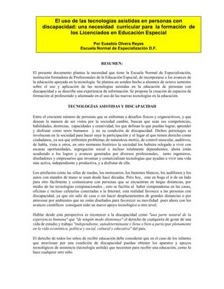 El documento destaca la importancia de integrar tecnologías asistidas en la educación de personas con discapacidad, enfatizando la necesidad de formar a docentes y alumnos en su utilización. A través de un estudio, se revela que los estudiantes de educación especial carecen de conocimiento sobre tecnologías adecuadas que mejoren el aprendizaje de estos estudiantes. Se concluye que, a pesar de las limitaciones actuales, es imperativo incorporar estos recursos en los planes de estudio para favorecer la inclusión y el desarrollo de habilidades en personas con discapacidad.