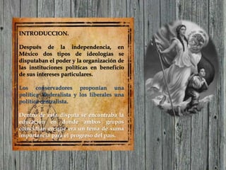 Durante las primeras décadas después de la independencia de México, los conservadores y liberales disputaban el poder político en el país. Aunque diferían en sus visiones de organización política, ambos grupos reconocían la importancia de la educación. La reforma educativa de 1833 buscó establecer el control estatal de la educación y promover la enseñanza elemental para todos, pero fue derogada después de un año debido a la oposición conservadora.
