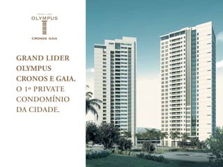 El documento presenta el proyecto inmobiliario Grand Lider Olympus, el primer condominio privado de la ciudad. Incluye áreas comunes como terrenos, plazas y piscinas, así como perspectivas ilustrativas de las torres Cronos y Gaia que tendrán departamentos de hasta 617m2 y 397m2 respectivamente con múltiples habitaciones, cocheras y amenities de lujo.
