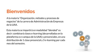 Este documento presenta la materia "Organización, métodos y procesos de negocios" de la carrera de Administración de Empresas. La materia se impartirá de forma blended, combinando clases presenciales y en línea. El objetivo general es comprender la importancia de la organización, métodos y procesos como herramienta estratégica para la mejora continua de las organizaciones. El contenido se distribuirá en tres parciales y la evaluación constará de tres exámenes parciales, un examen final escrito y prá