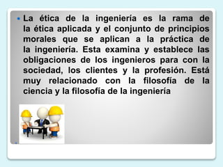 El documento describe los principios éticos que rigen la profesión de ingeniería. Explica que la ética de la ingeniería examina las obligaciones de los ingenieros hacia la sociedad, los clientes y la profesión. También presenta los fundamentos morales como el utilitarismo, la ética del deber, la ética de los derechos y la ética de la virtud. Finalmente, enumera los principios éticos que los ingenieros deben seguir como priorizar la seguridad pública, actuar con integridad y tratar a todas las personas de manera justa