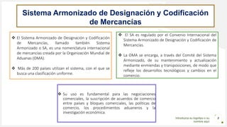 El documento describe las áreas de cooperación entre la Organización Mundial de Aduanas (OMA) y la Organización Mundial del Comercio (OMC). La OMA mantiene y actualiza el Sistema Armonizado, una clasificación uniforme de mercancías utilizada por más de 200 países, que es fundamental para las negociaciones comerciales y políticas aduaneras. La OMA y la OMC colaboran en el uso del Sistema Armonizado y en temas relacionados con el comercio internacional y los procedimientos aduaneros.