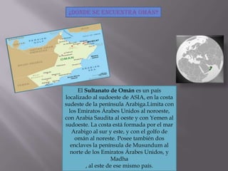 Omán es un país localizado en el suroeste de Asia, en la península Arábiga, con costas en el mar Arábigo y el golfo de Omán. Su economía depende de la explotación de gas natural y petróleo. Tiene algunas de las mejores playas según los turistas, con vistas al mar, hospedaje y comida de alta calidad. Respecto a los derechos humanos, Omán ha firmado o ratificado varios de los organismos de la Carta Internacional de Derechos Humanos.
