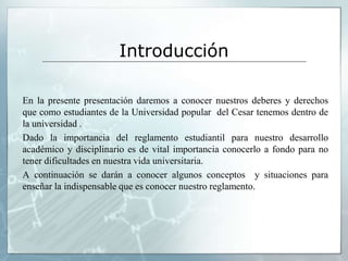 El documento explica que el reglamento estudiantil de la Universidad Popular del Cesar establece las normas y reglas que rigen a los estudiantes para guiarlos sobre sus deberes, derechos y el desarrollo de su vida universitaria. El reglamento define situaciones como fraude académico, agresión a profesores o compañeros, y cambio de carrera, así como los pasos a seguir en cada caso y las posibles consecuencias. Conocer el reglamento ayuda a los estudiantes a aprovechar su tiempo en la universidad y des
