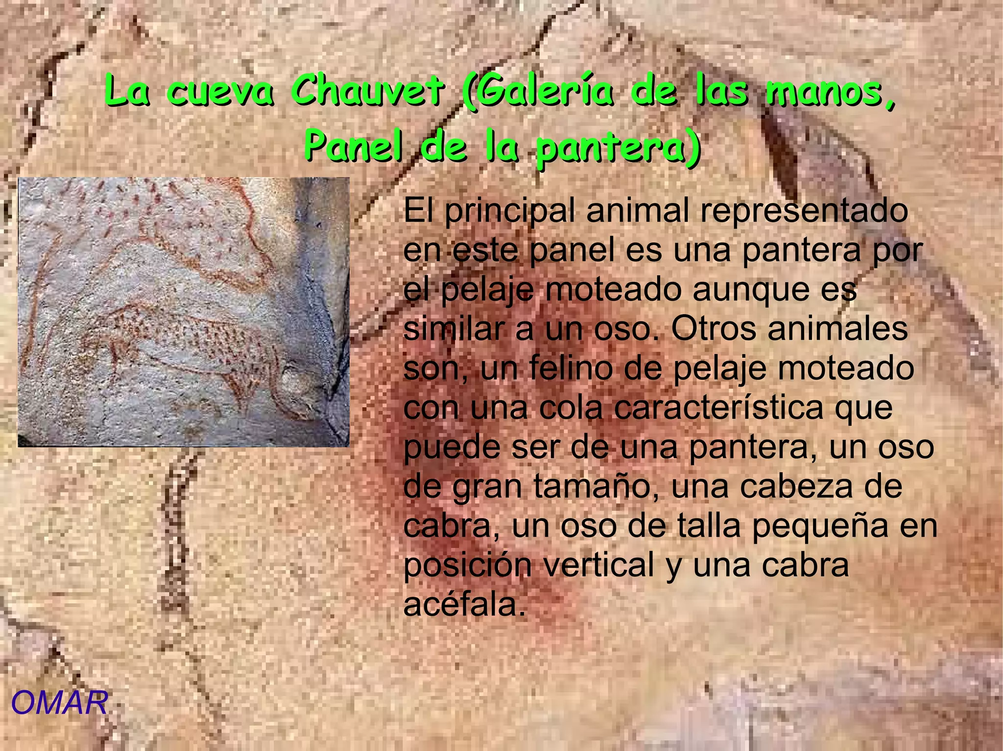 El panel representa varios animales, principalmente una pantera identificada por su pelaje moteado, aunque se parece a un oso. Otros animales incluyen otro felino moteado posiblemente una pantera, un gran oso, una cabeza de cabra y un pequeño oso de pie junto a una cabra sin cabeza.